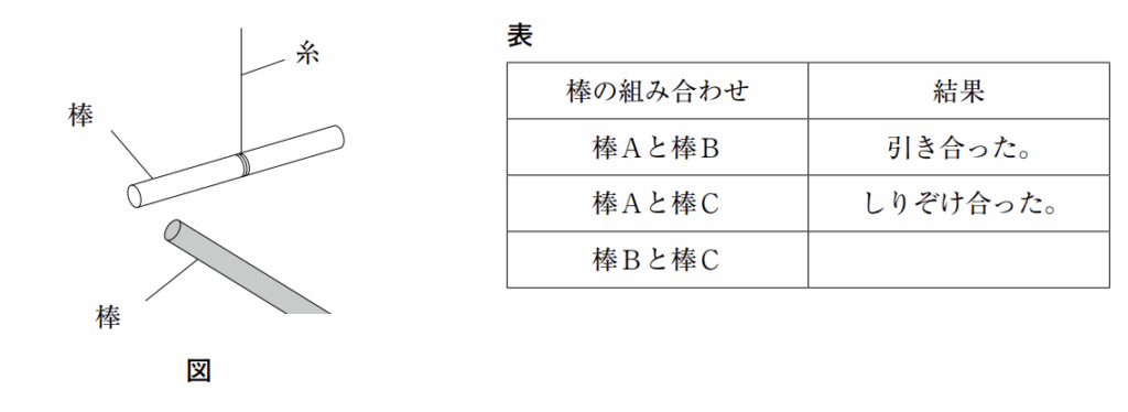 異なる絶縁体でできた 3 本の棒A~Cを布でこすり,棒に静電気をためた。これらの棒を用いて,図のように,1 本の棒を糸でつり下げ,別の 1 本の棒を近づけて,静電気を帯びた棒どうしが引き合うかしりぞけ合うかを棒の組み合わせを変えて調べた。表は,その結果をまとめている途中のものである。