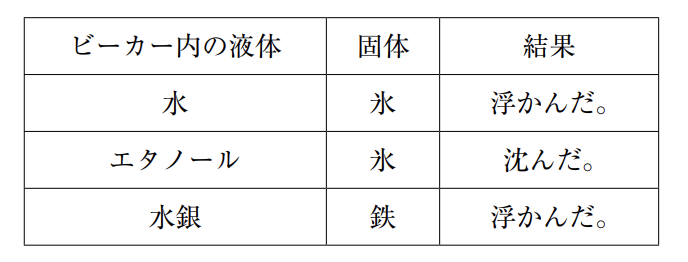 密度は小さい方が浮かぶので、「水>氷>エタノール」「水銀>鉄」という関係になります。