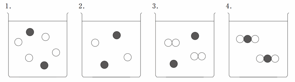 ビーカーに塩化銅水溶液が入っている。塩化銅 CuCl2 が水溶液中で電離しているようすを表すモデルとして最も適するものを次の中から一つ選び,その番号を答えなさい。ただし,●は銅イオンを,◯は塩化物イオンを表している。