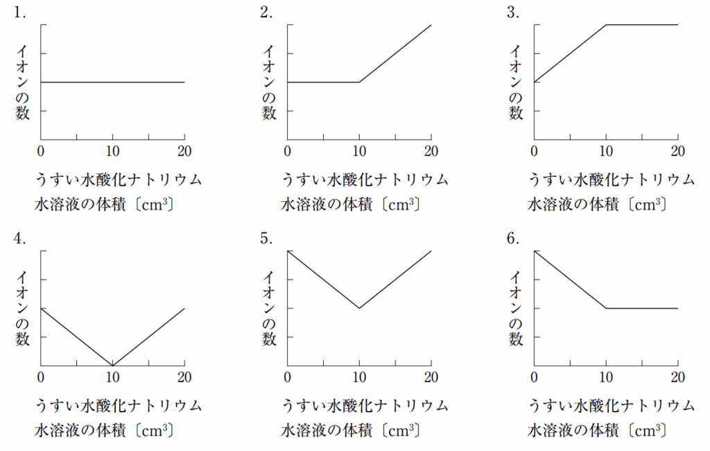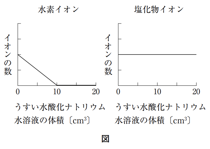 図は,ビーカーに入れたうすい塩酸 20cm3 に,うすい水酸化ナトリウム水溶液を少しずつ加えていったときの,ビーカー内にある水素イオンと塩化物イオンの数の変化を示したものである。