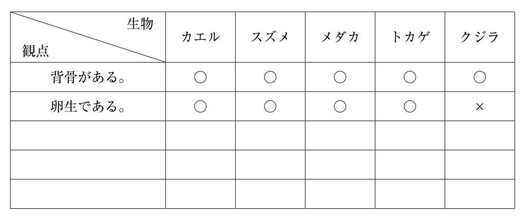 Kさんは,カエル,スズメ,メダカ,トカゲ,クジラを 5 つの異なるグループに分類することにした。次の表は,そのための観点をまとめている途中のものである。なお,表中の○は観点にあてはまることを,×はあてはまらないことを示している。
