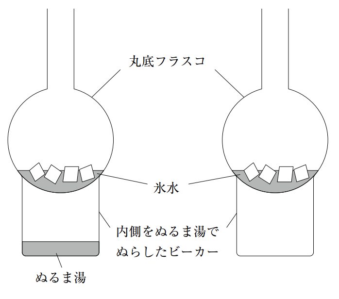 右の図のように,内側をぬるま湯でぬらした 2 つのビーカーを用意し,片方のビーカーにだけぬるま湯を入れた後,両方のビーカーの内部に線香の煙を入れた。次に,両方のビーカーの上に氷水を入れた丸底フラスコをのせて,ビーカー内に霧ができるかどうかを調べた。