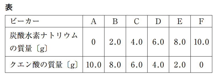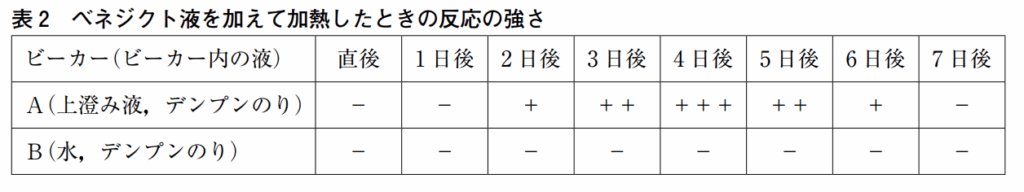 表 1 と表 2 はそれぞれ,操作アと操作イの結果をまとめたものである。なお,表 1 と表 2では,試験管内の液の色の変化の大きさから,ヨウ素液やベネジクト液による反応の強さを「+++」(とても強い),「++」(強い),「+」(弱い),「-」(反応なし)の 4 段階で記録した。