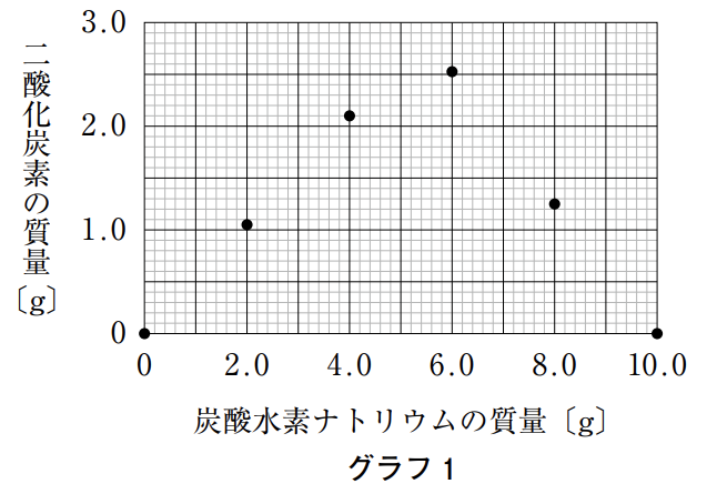 グラフ1より、二酸化炭素2.0gが発生するのは炭酸水素ナトリウムが3.8gのときです。