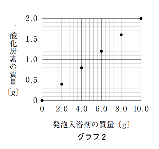 グラフ2より、二酸化炭素2.0gが発生するのは発砲入浴剤の質量が10.0gのときなので、$3.8\div10.0\times100=38%$が答えとなります。