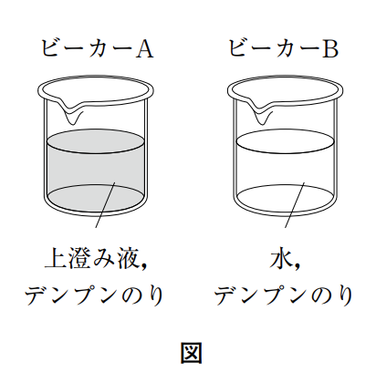 ② 図のように,ビーカーAには上澄み液を入れ,ビーカーBにはAと同じ体積の水を入れた後,ビーカーA,Bにデンプンのりを同じ体積ずつ加えて混ぜた。