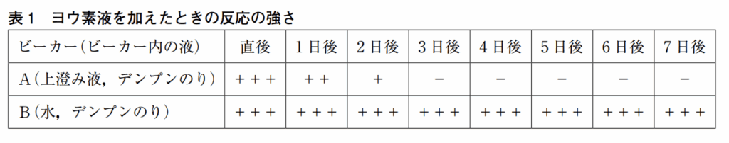 Kさん 「表 1 から,土の中の微生物がデンプンのりを分解したと考えられます。」