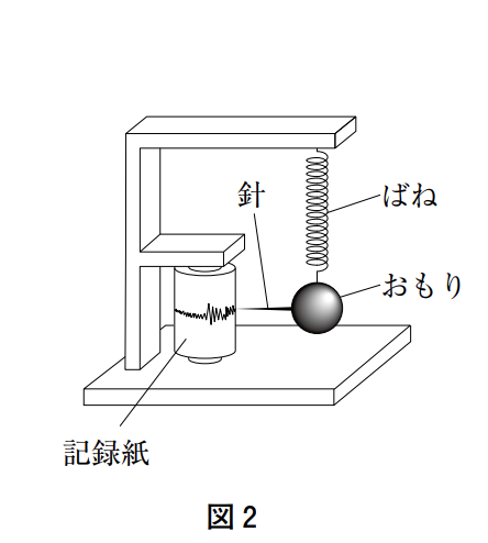 図 2 は,地震計を模式的に示したものである。この地震計は,地震によって地面が上下にゆれたとき,( )ために,地面のゆれが記録紙に記録されるしくみになっている。