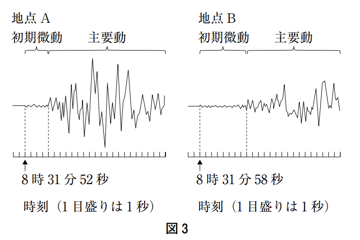図 3 は,ある地震における,震源からの距離が異なる 2 つの地点A,Bでの地震計の記録である。これらの記録から,地点Aでも地点Bでも,最初に小さなゆれ(初期微動)が始まり,続いて大きなゆれ(主要動)が始まったことがわかる。これらのゆれが始まった時刻を読みとると,地点A,Bと震央との距離の比がわかる。