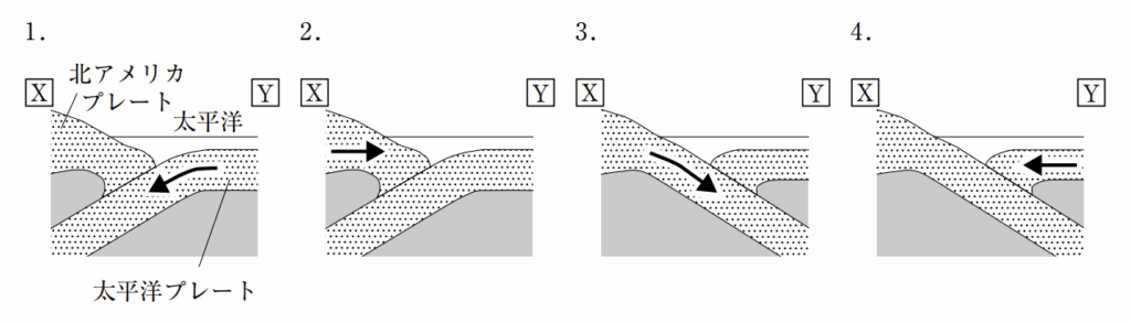 図 1 中の断面 [X]ー[ Y] におけるプレートのようすと,プレートが動く向きを矢印で示した模式図として最も適するものを次の中から一つ選び,その番号を答えなさい。