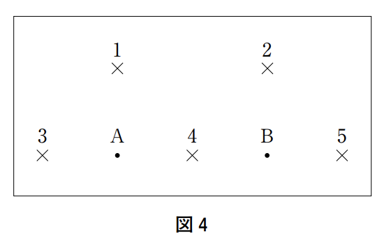 図 4 は,文中の下線部における地点Aと地点Bの地図上の位置関係を模式的に示したものである。図 4 中の 1~ 5 の地点のうちいずれかがこの地震の震央であるとすると,どの地点が震央と考えられるか。最も適するものを一つ選び,その番号を答えなさい。ただし,この地震は震源が浅いものとし,この地震におけるP波とS波の伝わる速さはそれぞれ一定であるものとする。また,図 4に示した地点の標高はすべて 0m であるものとする。