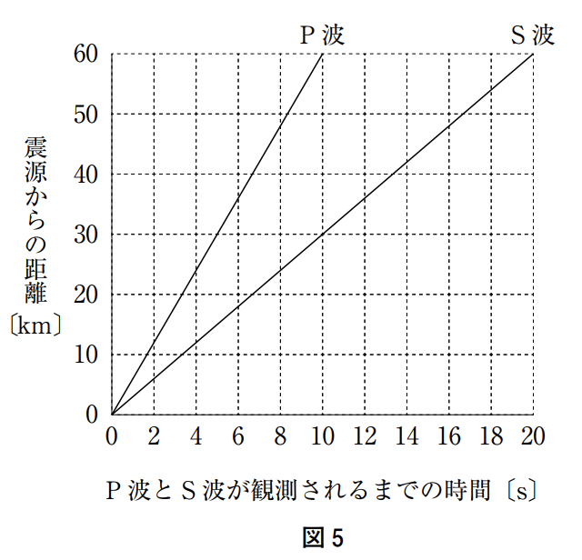 (ⅱ)図 5 から,震源からの距離が 120km である地点DにS波が届くのは,緊急地震速報が出されてから何秒後と考えられるか。ただし,この地震におけるP波とS波の伝わる速さはそれぞれ一定であるものとする。