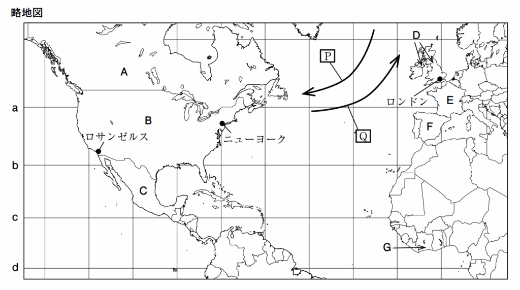 Kさんは,大西洋に面した地域について調べ,次の略地図と表 1 を作成した。これらについて,あとの各問いに答えなさい。なお,略地図中の緯線は赤道から,経線は本初子午線からそれぞれ 15 度ごとに引いたものである。また,[P],[Q]の矢印は,海流の向きを大まかに示したものである。
