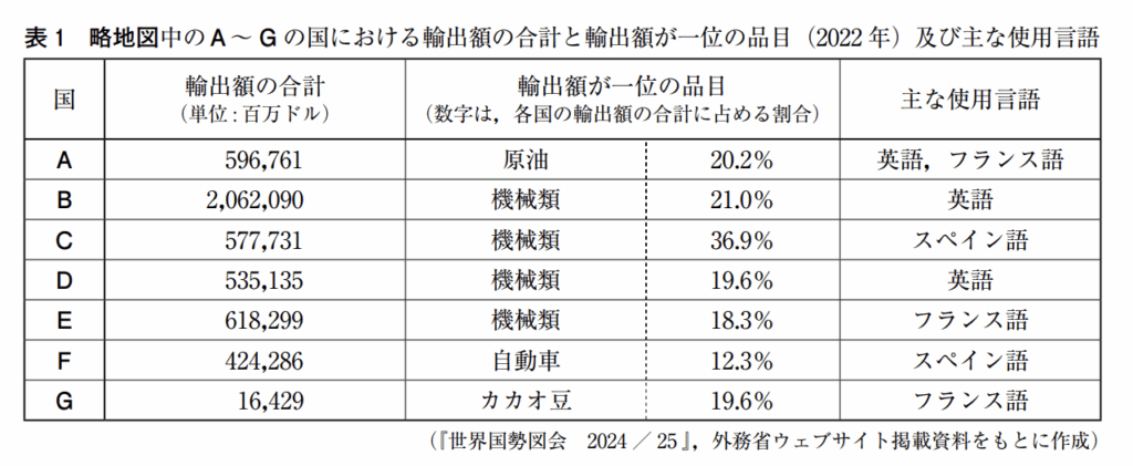 先 生: A~Gの国々の中で,[う]は遠く離れた場所にあるにもかかわらず,表 1 中の「主な使用言語」が共通しています。この歴史的な背景としてどのようなことがあげられますか。