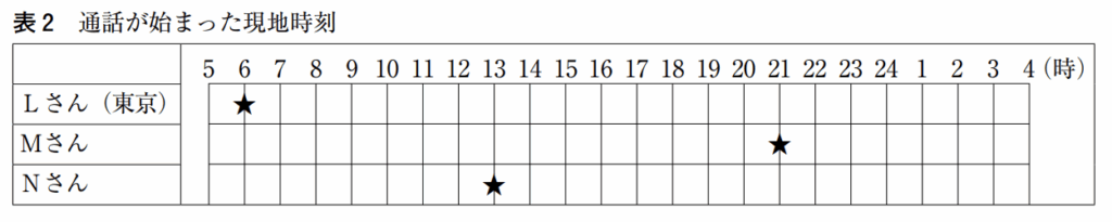 東京にいるLさんは,略地図で示されたいずれかの都市にいるMさん,Nさんとオンラインによる同時通話をおこなった。次の表 2 の★は,この通話が始まった現地時刻を示している。この通話が始まったときにMさんとNさんがいた都市の組み合わせとして最も適するものを,あとの 1 ~ 6 の中から一つ選び,その番号を答えなさい。ただし,サマータイムは考えないものとする。