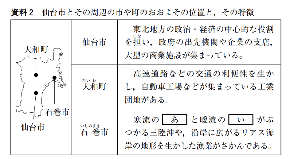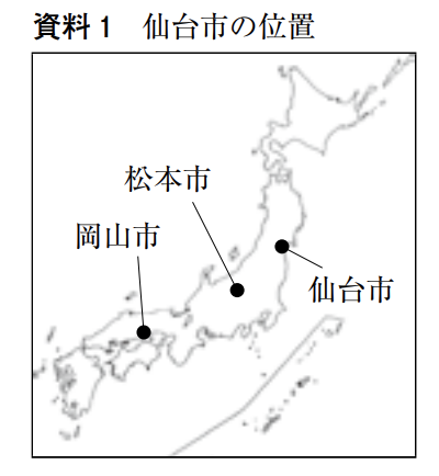 Kさんは,宮城県仙台市について調べ,次の資料 1 ~資料 3 を作成した。これらについて,あとの各問いに答えなさい。