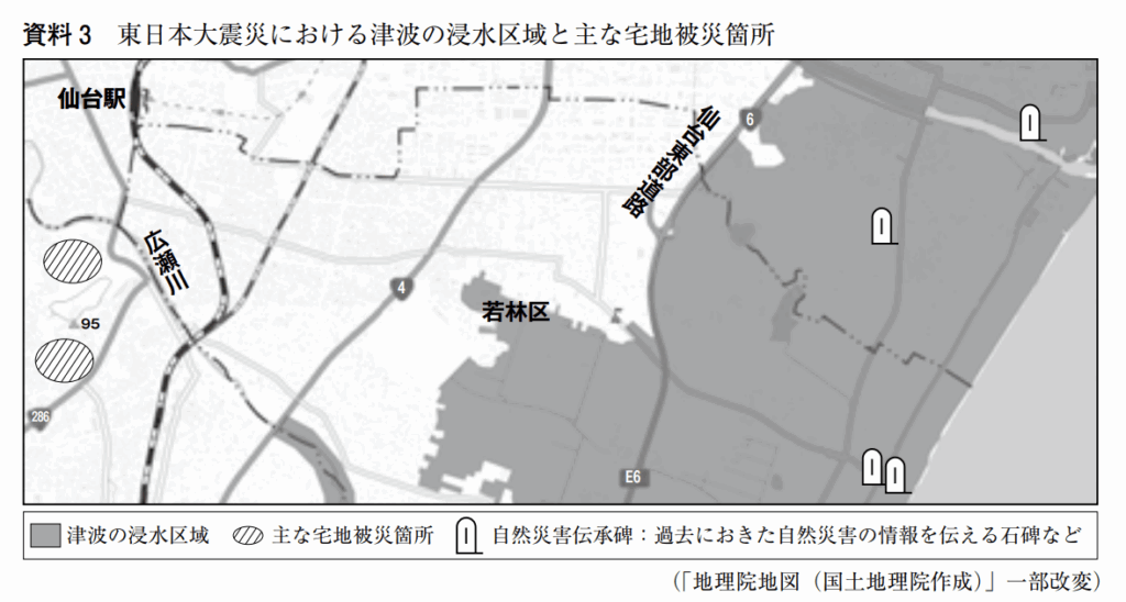Y 「主な宅地被災箇所」は,津波による被害が大きい,仙台駅を通る線路の東側にのみみられる。