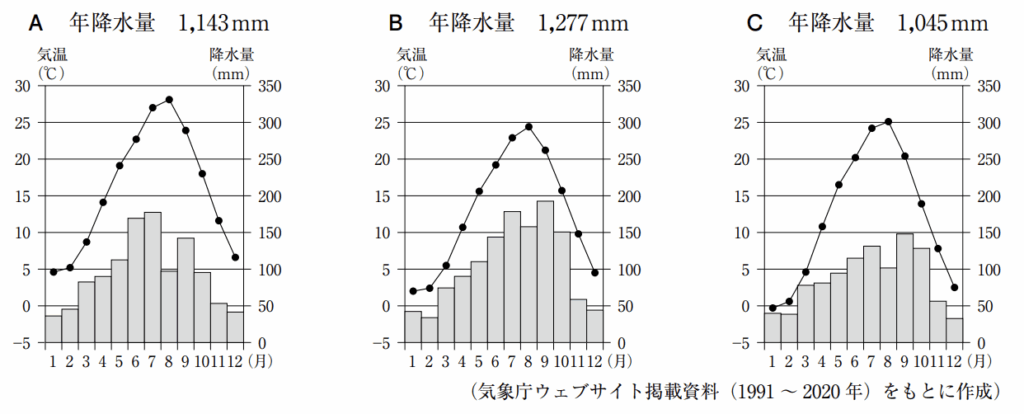 次のグラフA~Cは,資料 1 で示した都市の気温と降水量を示したものである。グラフと都市の組み合わせとして最も適するものを,あとの 1 ~ 6 の中から一つ選び,その番号を答えなさい。