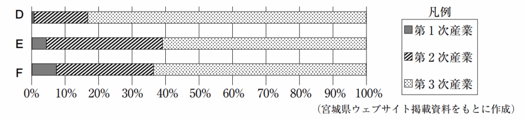 次に漁業が盛んな石巻市が第一次産業の割合が多いFになり、製造業が盛んな大和町が第二次産業の割合が多いEだとわかります。