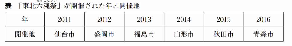 被災地では,非営利組織である[う]法人やボランティアが様々な支援をおこないました。また,復興を願って,東北地方の伝統的な祭りを一堂に集めた「東北六魂祭」が開催されました。表から,「東北六魂祭」の開催地は,すべて[え]であることがわかります。