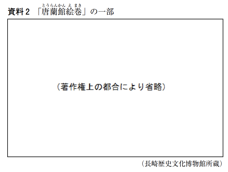 資料 2 は,オランダ商館の医者であるシーボルトと深い関係のある人物によって描かれたもので,唐人屋敷でおこなわれた龍踊とよばれる芸能の様子を表しています。龍踊はもともと中国の催し物ですが,唐人屋敷の近くに住んでいた日本の町民がこれを教わり,現在でも長崎独特の芸能として残っています。