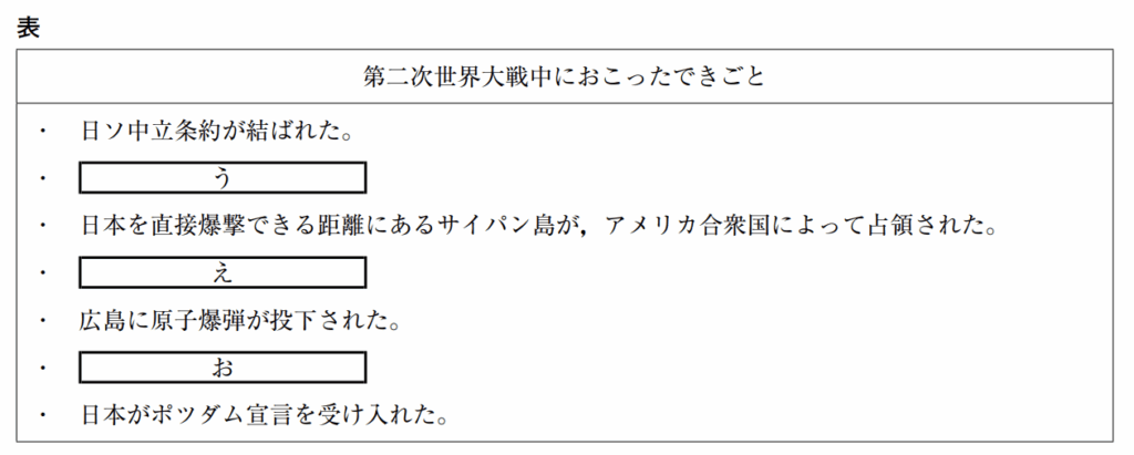 ーーー線②に関して,次の表は,Kさんが第二次世界大戦中におこったできごとを年代の古い順に並べたものである。表中の[う]~[お]にあてはまるできごとⅠ~Ⅲの組み合わせとして最も適するものを,あとの 1 ~ 6 の中から一つ選び,その番号を答えなさい。
