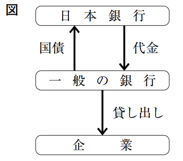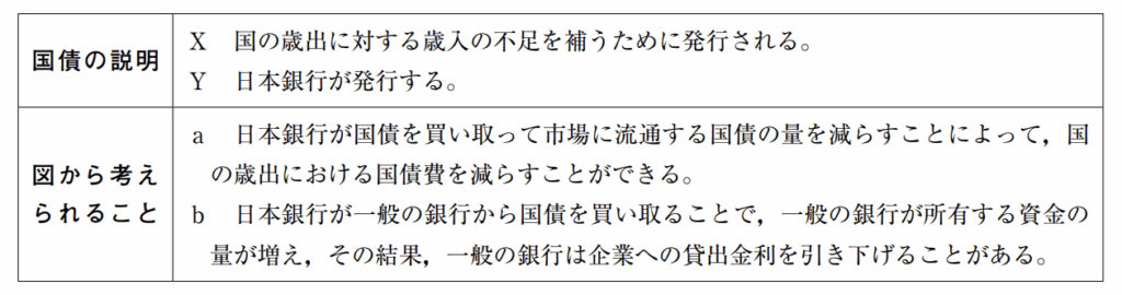 図は,ーーー線④による金融政策の一例を模式的に示したものである。国債の説明をⅩ,Yから,図から考えられることをa,bから,最も適するものをそれぞれ一つずつ選んだときの組み合わせを,あとの 1 ~ 4 の中から一つ選び,その番号を答えなさい。