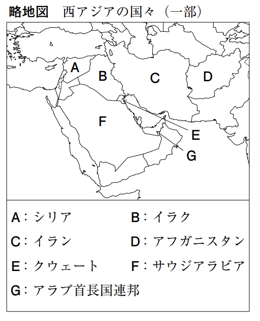 Kさんは,西アジアについて調べ,次のレポートと略地図を作成した。これらについて,あとの各問いに答えなさい。