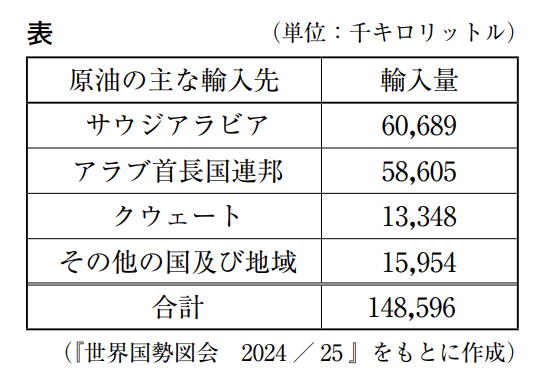ーーー線②について,次の表は,2023 年の日本における原油の主な輸入先と輸入量を示したものである。表と略地図に関して述べた文X,Yの正誤の組み合わせとして最も適するものを,あとの 1 ~ 4 の中から一つ選び,その番号を答えなさい。