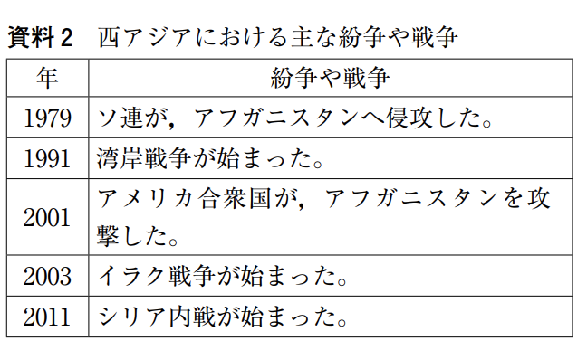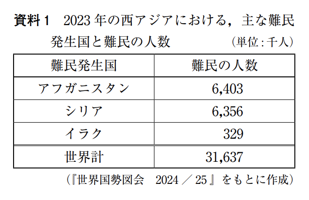 西アジアでは,紛争により,大勢の難民が発生しています。難民の保護活動は,国連難民高等弁務官事務所(UNHCR)を中心におこなわれ,日本は,1981 年に「難民の地位に関する③条約」を承認しました。④難民の発生や,国際社会における日本の役割について考えてみたいと思います。