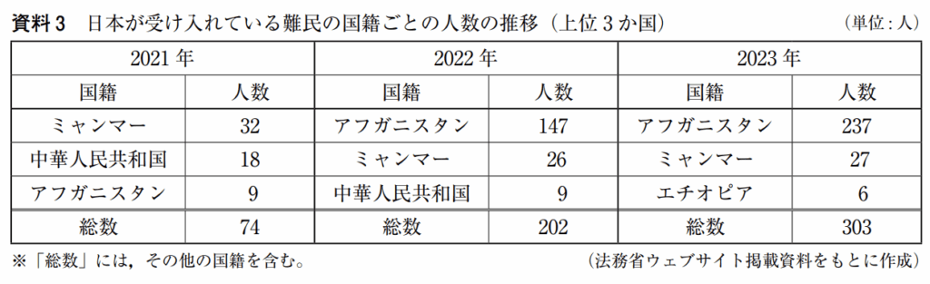 e 2021 年から 2023 年にかけて,「日本が受け入れている難民の総数」が増加していることは,資料 4 中の===の法律がこの期間に制定されたことと関係している。
