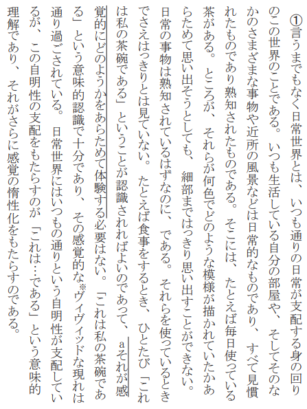 由香: そうだね。筆者は日常世界を意味の 衣に覆われた世界とし、意味の衣に覆われる以前の 先意味的世界と区別して い るよ。