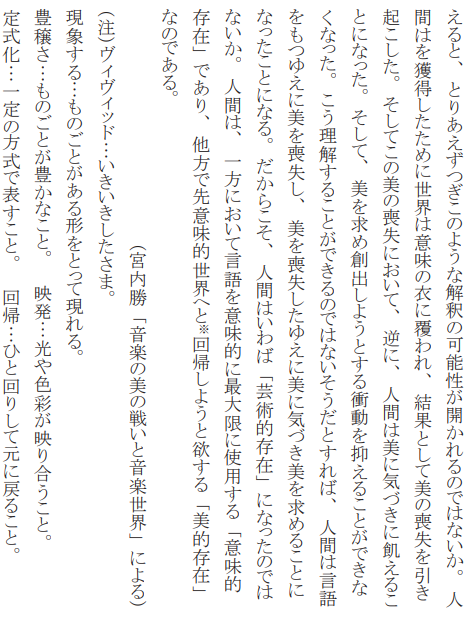 敬一 : 意味の 衣に覆われたため、私たちは美を消失したけれど、それがかえって【 C 】強い思いをこらえられなくなることへとつながっ て いくんだね。本文をよく理解で きたし、つぎは新聞の テーマ について 話し合おうか。