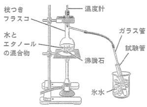 操作② 試験管を3本用意する。右の図のような装置で、水とエタノールの混合物を弱火で加熱し、ガラス管から出てくる気体を氷水で冷やし、液体にして1本目の試験管に集める。