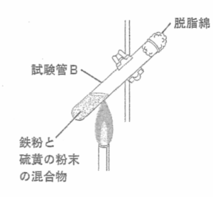 試験管A・Bを用意した。鉄粉2.1g と硫黄の粉末1.2g をよく混ぜ、