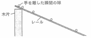 (2) レールの下に木片を置いて斜面の角度を一定にし、レール上に球を置いて手で支え、