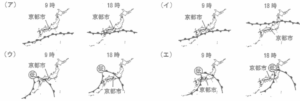 (1) 3月5日の9時と18時の日本付近における前線の位置をそれぞれ模式的に表した図の組み合わせは、次のア~エのいずれかである。