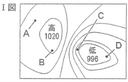 Ⅰ図は、高気圧と 低気圧の気圧配置を模式的に表したものであり、曲線は等圧線を表している。Ⅰ図のような気圧配置のとき、地点A~Dのうち、風が最も強くふくと考えられる地点として適当なものを1つ選べ。 また、次の文は、花子さんが北半球における高気圧の地表付近の風向についてまとめたものである。文中の□□□に入る表現として最も適当なものを、