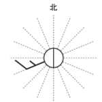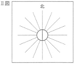 (3) 右のⅡ図は、天気は晴れ、風向は西南西、風力は2を、天気図に用いる記号で表そうとした途中のものであり、風向 ・風力をかきこむと完成する。 図中に、風向は西南西、風力は2であることを表す天気図に用いる記号を実線( ー )でかいて示せ。