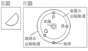 Ⅲ図の金星は、右下(西側)の半分に太陽の光が当たっているので、Ⅳ図ではQの位置にある。
