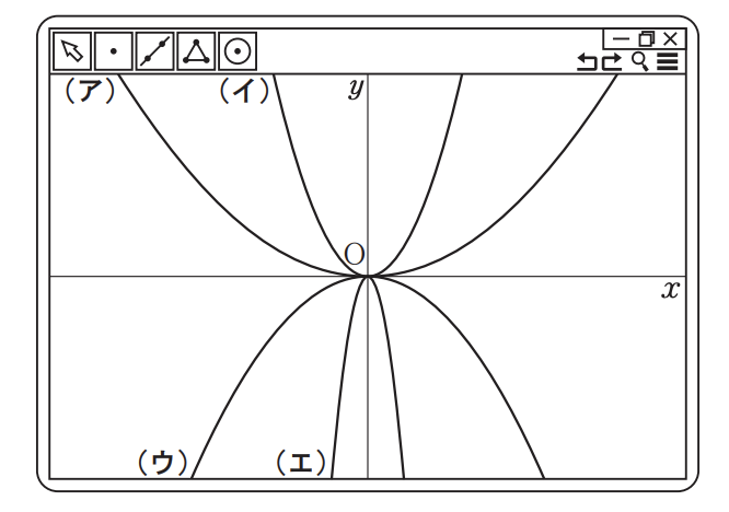 ( 7 ) 右の図は,グラフ作成ソフトウェアで 4 つの関数のグラフを表示させた,コンピュータの画面を表した ものであり,(ア)~(エ)はそれぞれ,関数 y = x², y=1/7x²,y =-7x²,y = -2/7x² のグラフのい ずれかである。図中の(ア)~(エ)のうち,関数y = -2/7x² のグラフにあたるものとして最も適当 なものを 1 つ選べ。