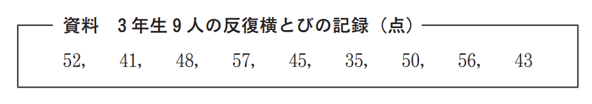 ( 8 ) 次の資料は,ある中学校の 3 年生 9 人の反復横とびの記録をまとめたものである。この資料について,3 年生 の記録の四分位範囲を求めよ。