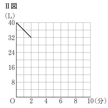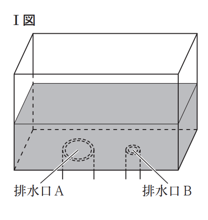 右のⅠ図のように,排水口A,Bがついている水そうがあり,排水口A,Bは どちらも閉じた状態で,水そうには40Lの水が入っている。排水口Aを開くと毎分4Lの割合で水そうから水が出て,排水口Bを開くと毎分 1Lの割合で水そ うから水が出る。