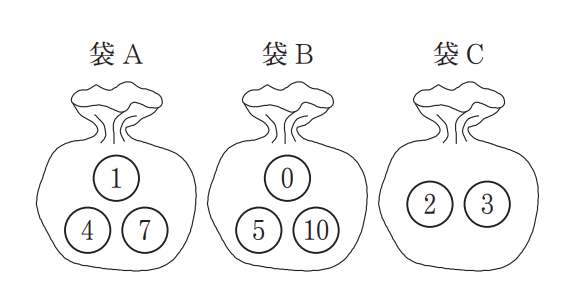図のように,1 ,4 ,7 の数が1つずつ書かれた 3 個の玉が入っている袋Aと,0 ,5 ,10 の数が 1 つずつ書かれた 3 個の玉が 入っている袋Bと,2 ,3 の数が 1 つずつ書かれた2個の玉が入っている袋Cがある。それぞれの袋から1個ずつ玉を取り出し,袋Aから取り出した玉に書かれている数をa,袋Bから取り出した玉に 書かれている数をb,袋Cから取り出した玉に書かれている数をcとする。