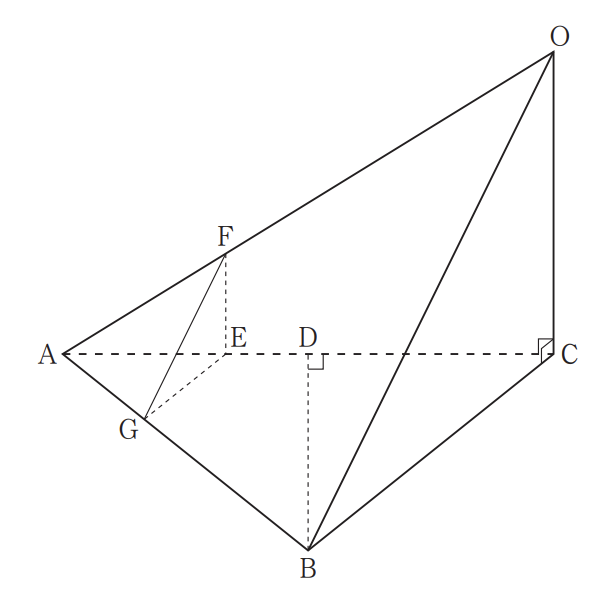 図のように,三角錐すいOABCがあり,OC = 9 cm,AB=BC=10 cm,AC=12 cm,∠OCA=∠OCB=90° である。頂点Bから辺ACにひいた垂線と辺ACとの交点をDとする。また,線分AD上に点Eを,AE:ED = 2:1 となるようにとり,点Eを通り平面OBCに平行な平面と,2 辺OA,ABとの交点をそれぞれF,Gとする。
