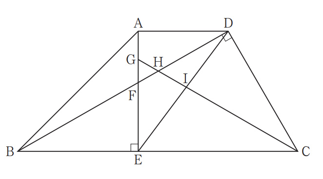 図のように,四角形ABCDがあり,AB = 3 √2 cm, BC= 7 cm,∠ABC= 45° ,∠BCD= 60° ,∠BDC= 90° である。頂点Aから辺BCにひいた垂線と辺BC,対角線BD との交点をそれぞれE,Fとする。また,∠BCDの二等分線 と線分AE,対角線BD,線分DEとの交点をそれぞれG, H,Iとする。
