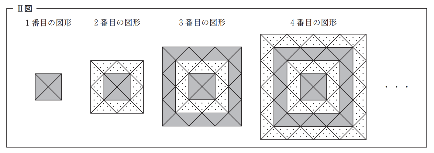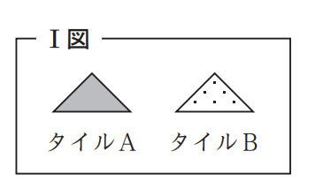 Ⅰ図のような,タイルAとタイルBが,それぞれたくさんある。タイルAと タイルBを,次のⅡ図のように,すき間なく規則的に並べたものを,1 番目の図形, 2 番目の図形,3 番目の図形,4 番目の図形,…とする。