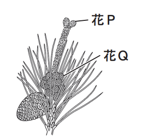 (3) 図は,マツの枝を表したものである。図中の花P・Qの一方は雄花であり,もう 一方は雌花である。マツの雄花として最も適当なものを,花P・Qから 1 つ選べ。 また,マツの特徴について述べた文として最も適当なものを,次の(ア)~(ウ)から1 つ選べ。
