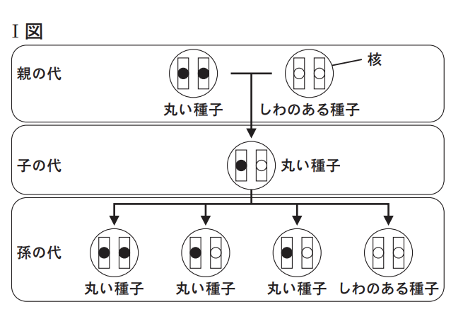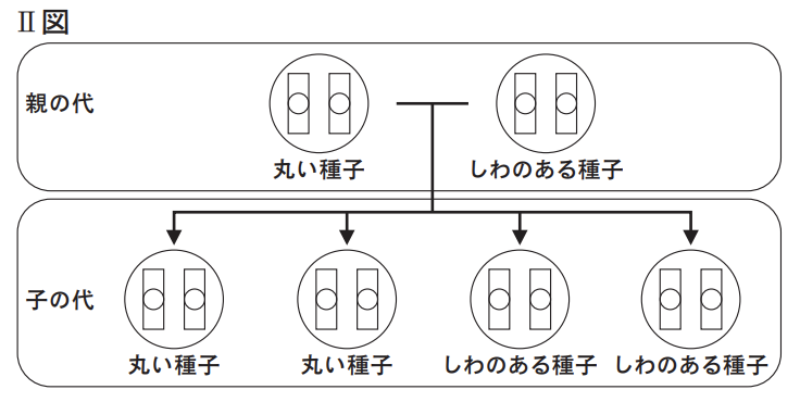(2)健さんは,遺伝子の組み合わせがわからない丸 い種子のエンドウと,しわのある種子のエンドウ を親としてかけ合わせる実験を行い,できた子の 代の種子の形を調べた。その結果,丸い種子としわのある種子が約 1:1 の割合でできた。右のⅡ図は,健さんが行った実験における親の代と子の代の,種子の形を決める遺伝子の組み合わせを 模式的に表そうとした途中のものである。Ⅱ図中の染色体に存在する種子の形を決める遺伝子のうち,種子を丸くする遺伝子にあたるものを黒く塗るとⅡ図は完成する。ノートを参考にして,答案用紙の図中の染色体に存在する遺伝子のうち,健さんが行った実験における親の代と子の代の,種子の形を決める遺伝子の組み合わせを表すために必要なものをすべて黒く塗って,図を完成させよ。