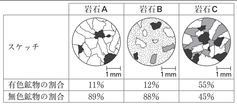 先生 そうですね。それでは,岩石A~Cを区別してみましょう。岩石A~Cは,流紋岩,花こう岩,斑れい岩のいずれかです。表は,岩石A~Cを ②ルーペで観察したときのスケッチと,各岩石にふくまれる有色鉱物と無色鉱物のそれぞれの割合をまとめ たものです。まず,岩石Aは何か考えてみましょう。